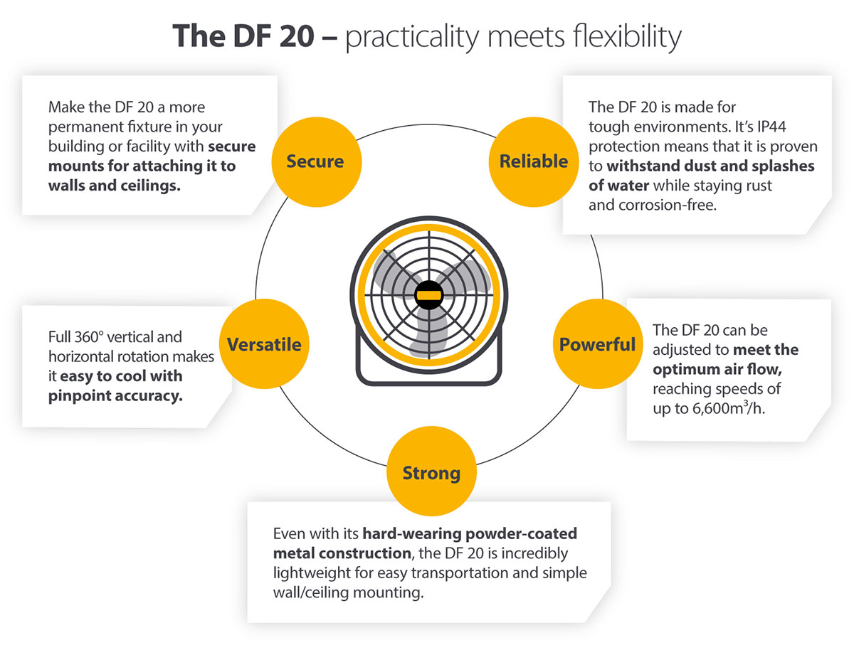 Благодаря своей прочной конструкции и возможности вращения на 360° DF 20 может обеспечить прохладный воздух по требованию, не мешая проведению мероприятий и не становясь препятствием для гостей.