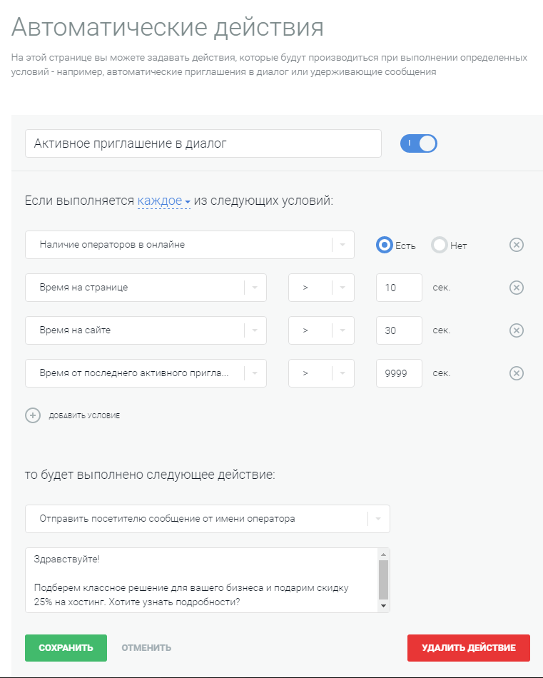 Как у нас: мы задали 4 условия, при одновременном выполнении которых активируется приглашение в чат.