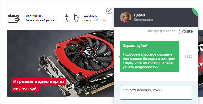 Как видите, настроить онлайн-чат просто: необходимо лишь представить себя на месте пользователя и понять, какое сообщение его может заинтересовать и принести пользу. Клиенты, для которых мы настраивали онлайн-консультант JivoSite, говорят, что на онлайн-чат приходится львиная доля продаж. А для одного из магазинов шин и дисков сервис стал основным каналом – настолько удачно удалось интегрировать его в бизнес-процессы.