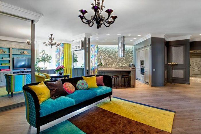 Не волнуйтесь, участие в интерьере могут принимать не только яркие цвета: пастельные тона не будут не использованными в этой стилистике. Сочитайте между собой бирюзовый и малиновый оттенки, ведь они будут считаться действительно удачными. Можно пользоваться сочетаниями фиолетовых и лиловых оттенков с черным или белым. Но не стоит допускать ошибок в сочетании. Используйте специальные цветовые таблицы, чтобы не превратить интерьер в разноцветное нечто.